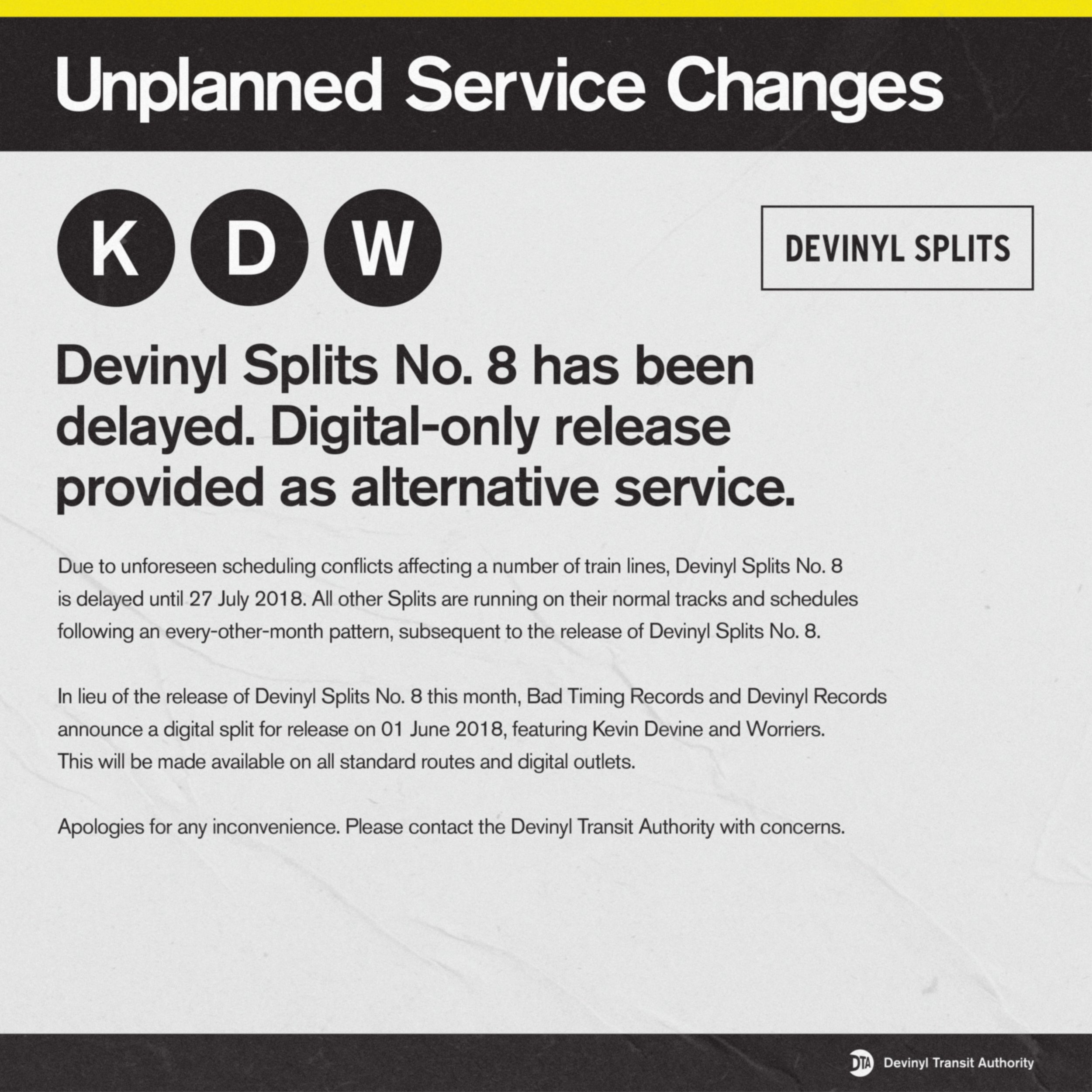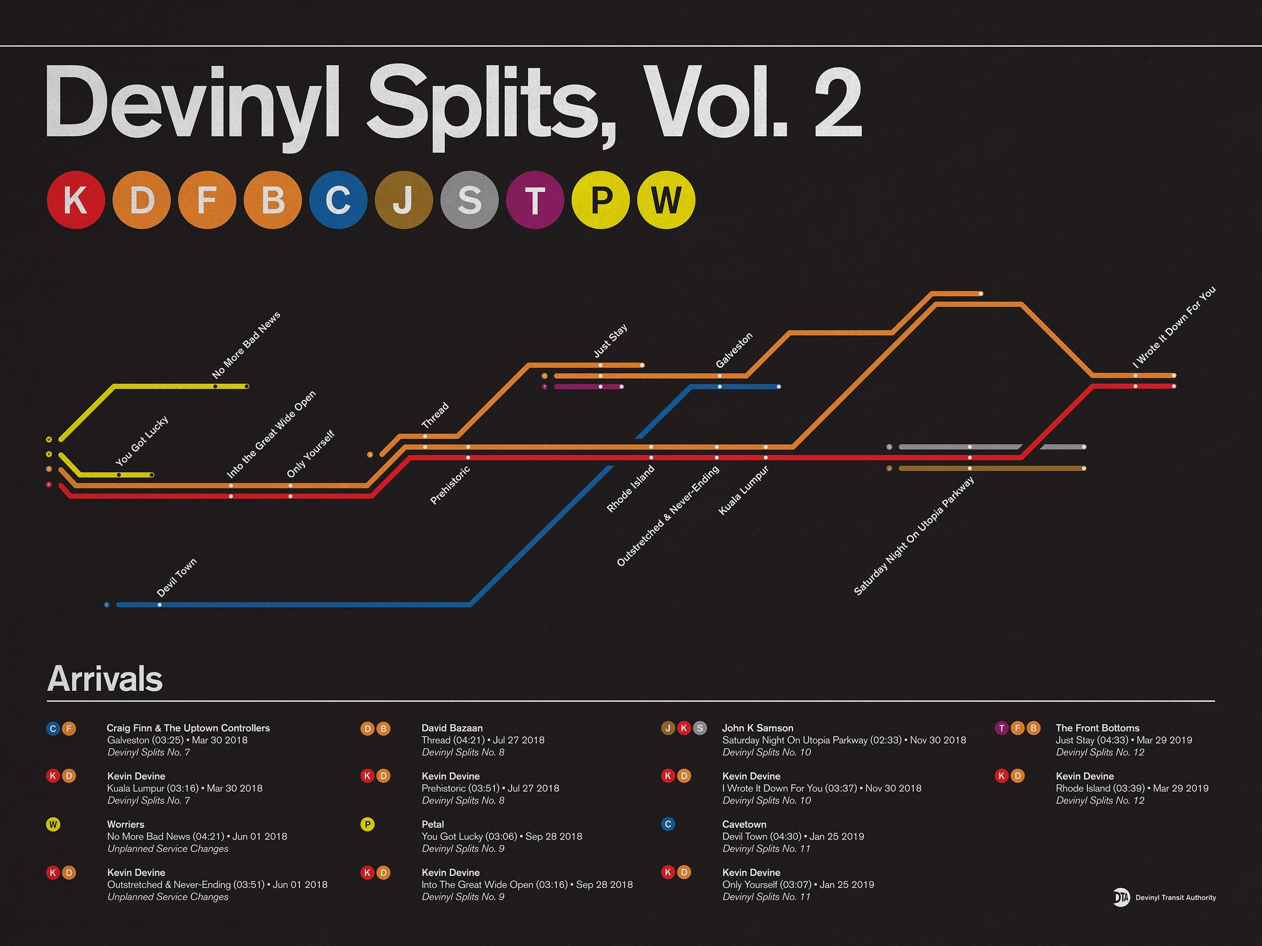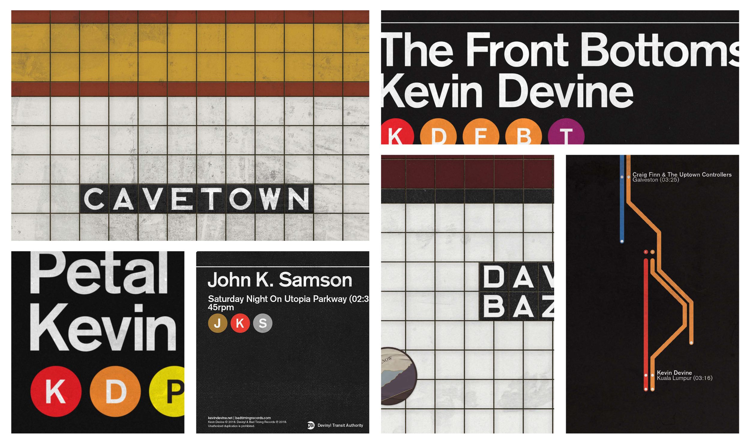 Over the course of 2018, Kevin Devine planned to put out a series of music, entitled Devinyl Splits. The series would consist of six 7-inch albums; Each album would be a “split,” meaning one side would feature a song by him and the other side would feature a song by another artist. Each of the six albums in the series would feature a different artist—so in total, twelve songs over the course of six releases with six unique artists. The artwork needed to have a consistent look throughout the series and Kevin Devine, being a native New Yorker, wanted the art to have a distinctively New York vibe that felt authentic.
